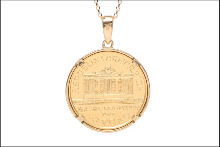 800余年の伝統を持つオーストリア造幣局発行、オーストリア政府が保証する法定通貨です。純度は、99.9%。表面には、ウィーン・フィルハーモニー管弦楽団の定期演奏会場の「楽友協会:黄金の間のパイプオルガン」、裏にはウィーンホルン、ハープ、ビオラ、バイオリン、ファゴットなどの管弦楽器をレリーフ。資産保全としてはもちろん、その美しさからも人気です。サイズは1/10オンスで胸元にピッタリのサイズ感です。